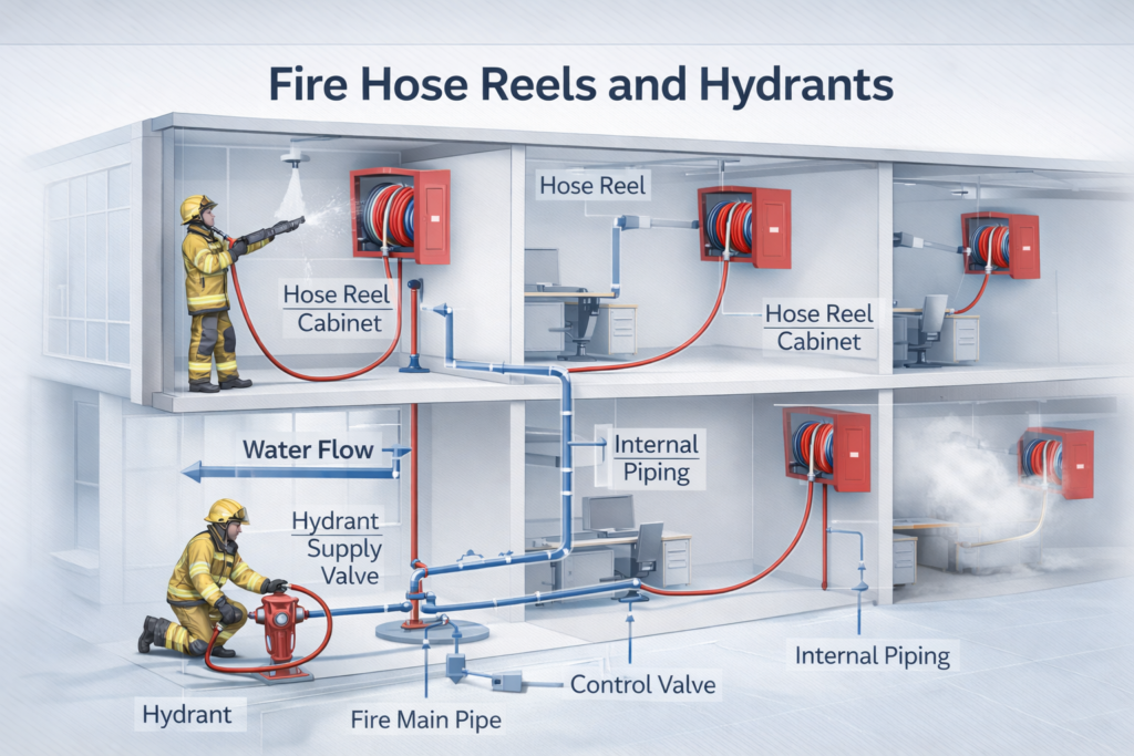 Fire hose reels and hydrant systems play a vital role in strengthening a building’s fire response capability, providing the necessary resources to control fires effectively and prevent further escalation.