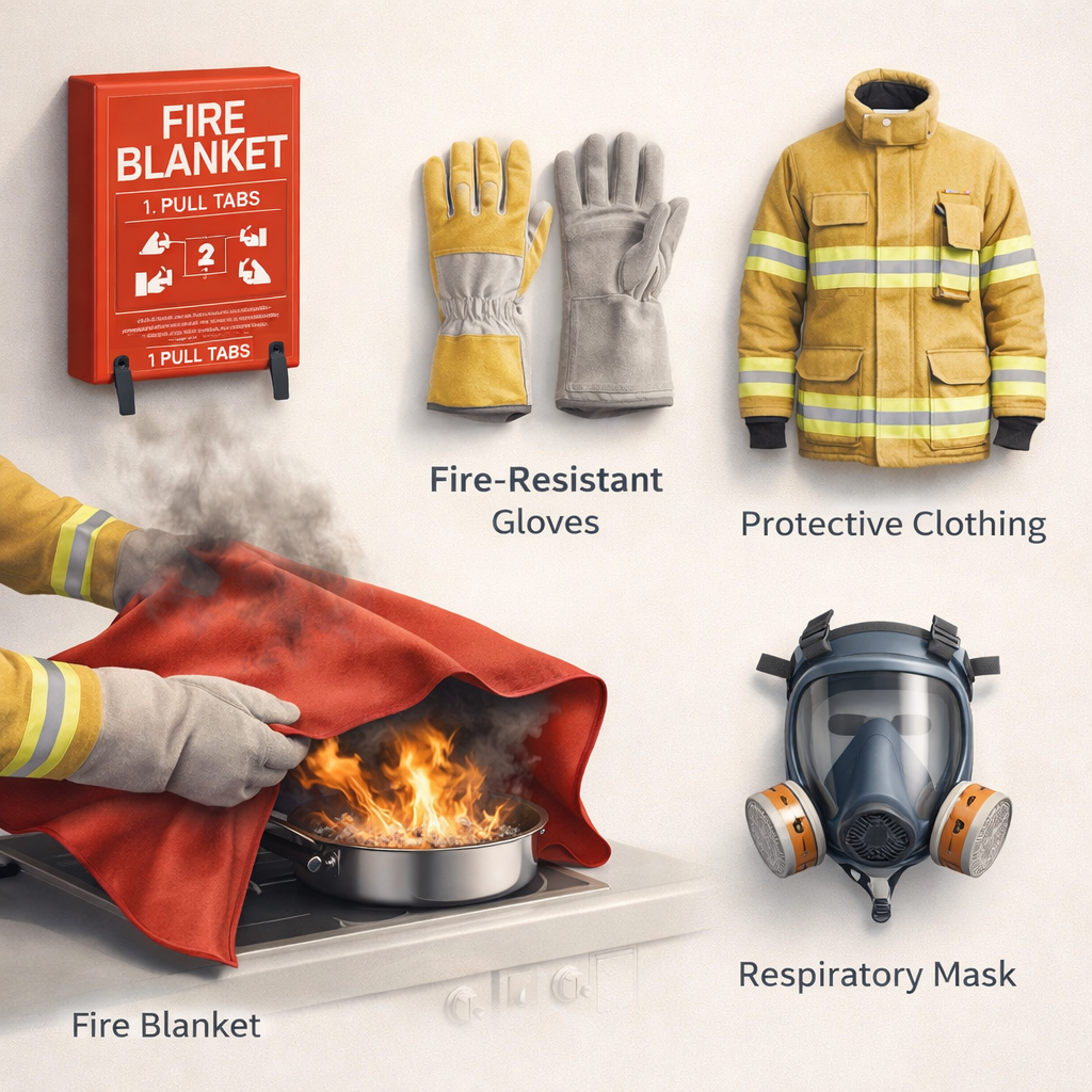Fire blankets are typically made from fire-resistant materials and are used to smother flames by cutting off the oxygen supply, which is a key element required for combustion. They are especially effective in situations where using water or extinguishers may not be appropriate or safe. In addition to fire blankets, personal safety equipment such as heat-resistant gloves, protective clothing, and respiratory protection devices helps individuals safeguard themselves while responding to fire incidents or evacuating hazardous areas.