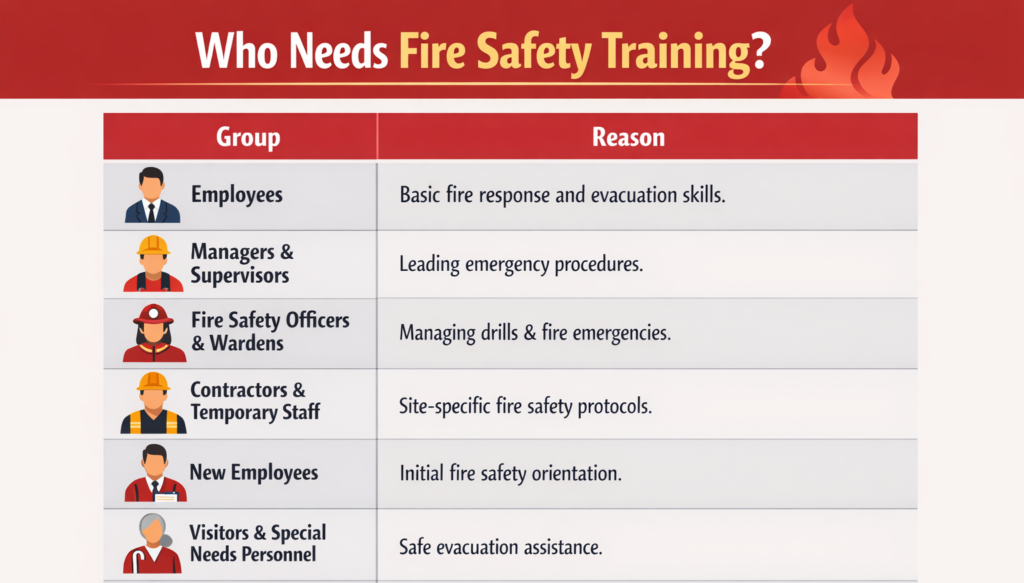 Fire safety training is essential for anyone who lives, works, or manages environments where fire risks may exist. Fires do not discriminate—they can occur in homes, offices, construction sites, or industrial facilities. Therefore, having the right knowledge and preparedness is important for a wide range of individuals. Whether for professional responsibility or personal safety, fire safety training ensures that people can prevent incidents and respond effectively in emergencies.