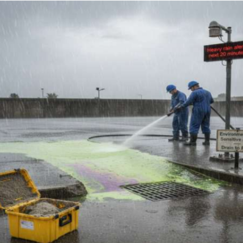 The picture shows an industrial yard during rainfall: