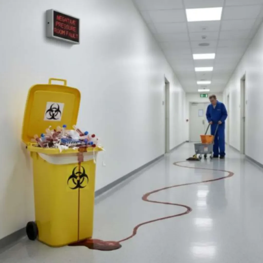- A small digital panel on the wall flashing “Negative Pressure Room Fault”.