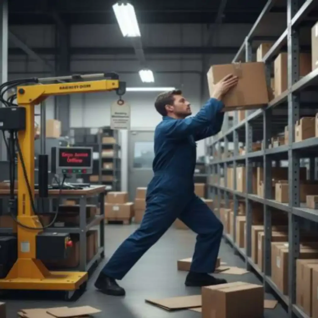 - A worker twisting to lift a load onto a shelf above shoulder height.