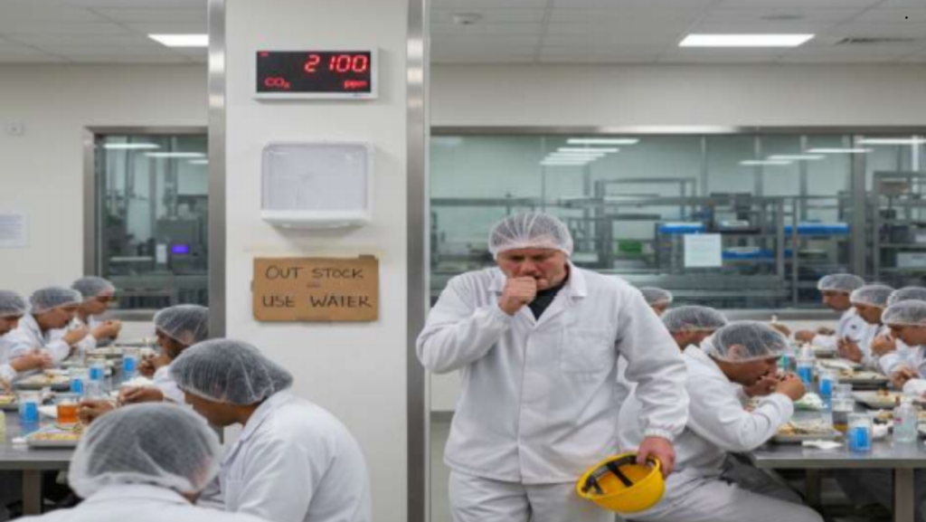The picture shows a communal staff area in a food-processing plant: