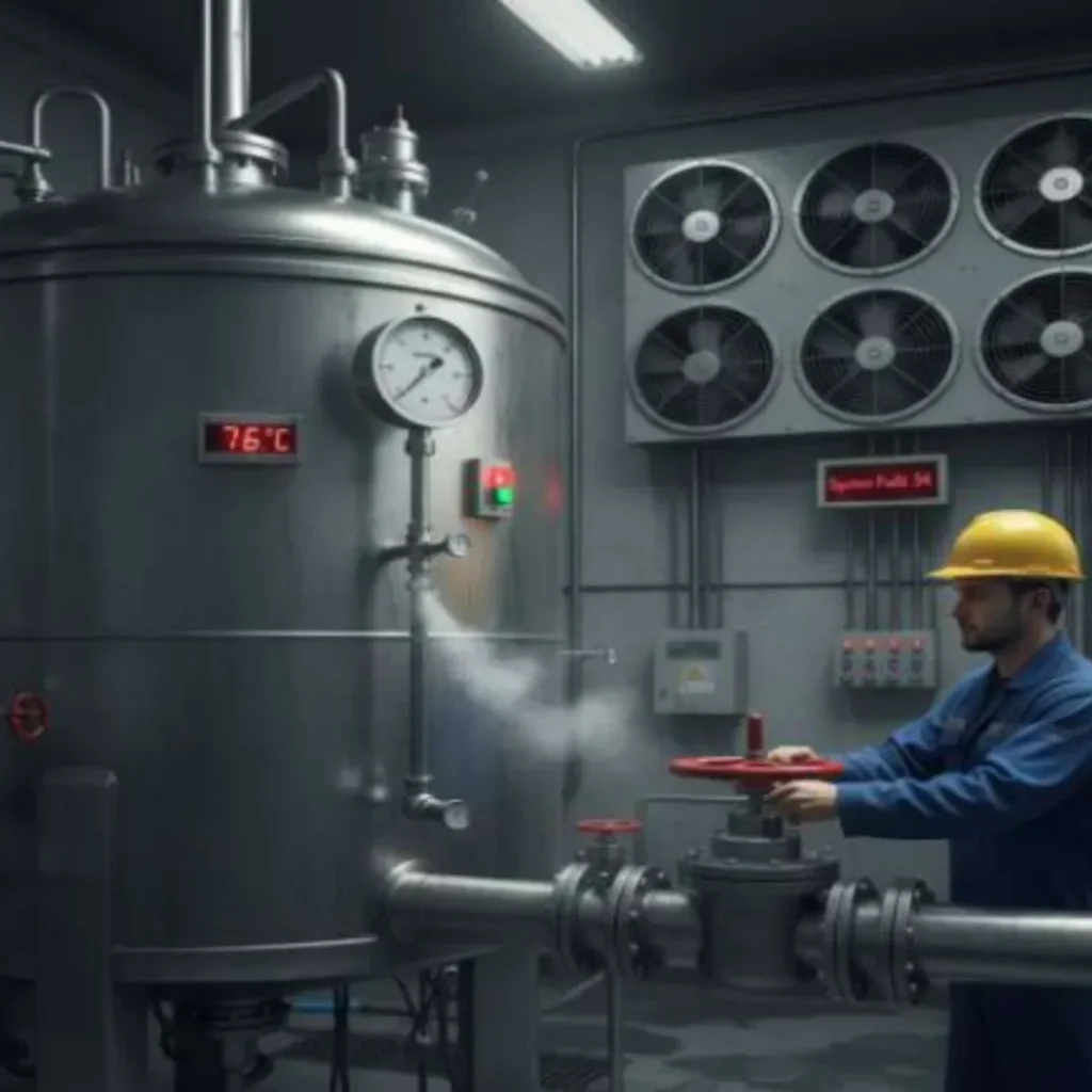 - The tank temperature display reads 76°C, which is above safe reaction limits.