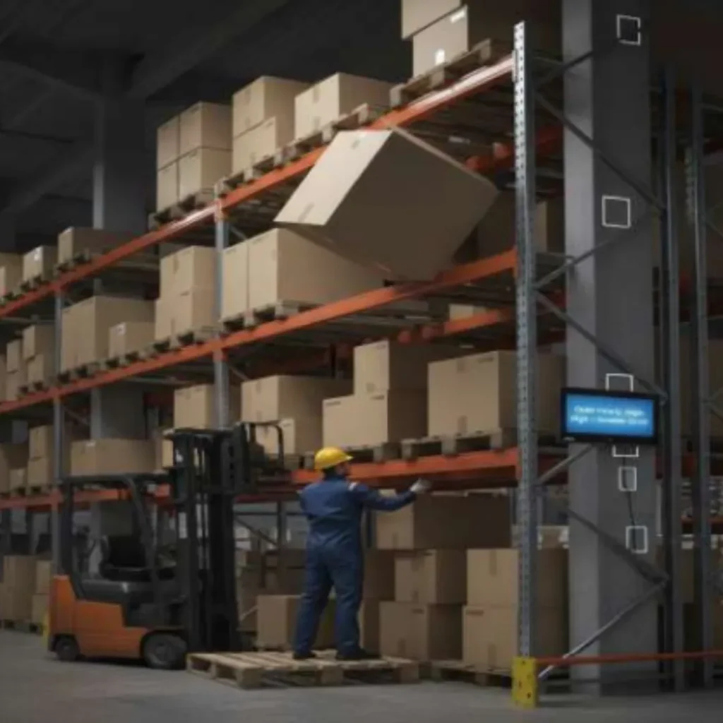 - Boxes are stacked unevenly on the floor, narrowing the worker’s movement space.