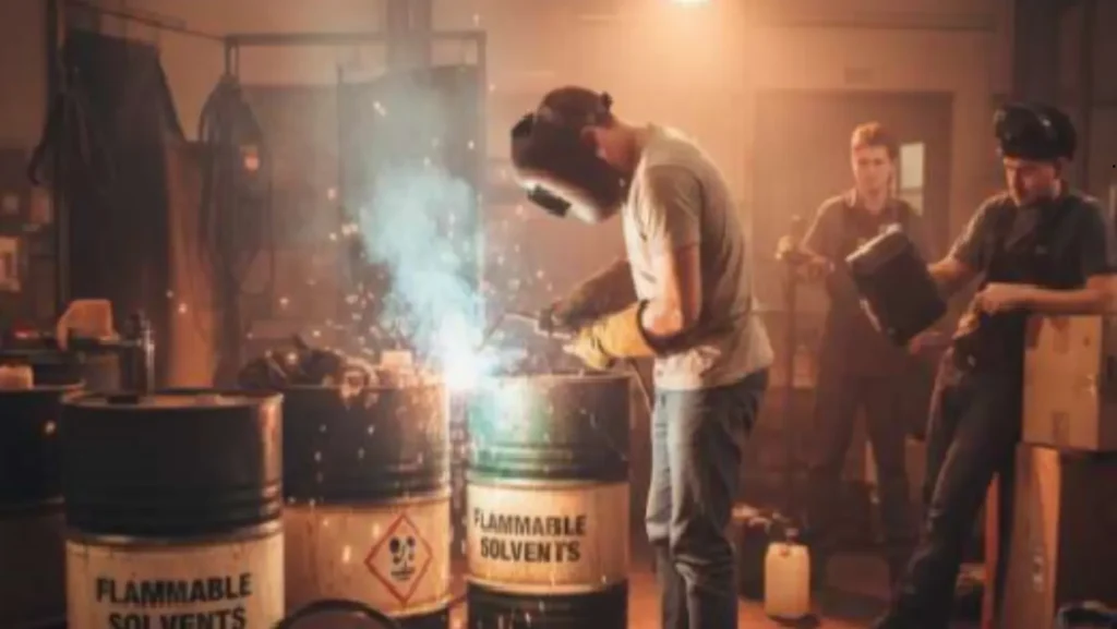 A photograph shows welding operations near flammable solvents, no fire-resistant curtains, and staff not wearing PPE.