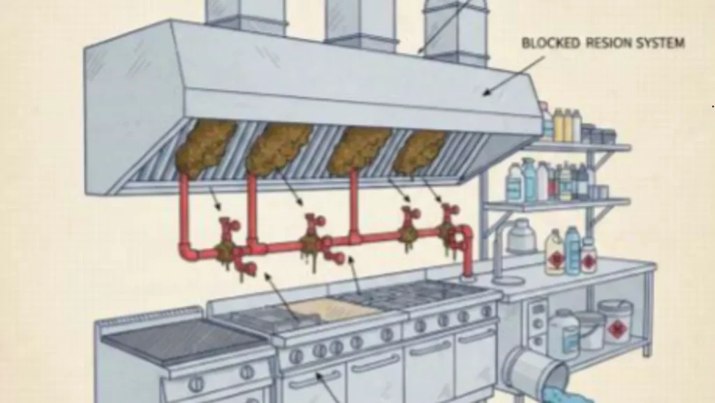 A diagram of a commercial kitchen shows grease accumulation in extraction hoods, blocked fire suppression system, and inappropriate storage of cleaning chemicals near heat sources