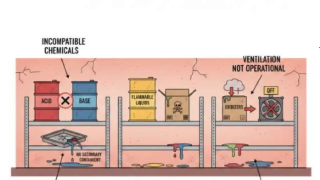 A diagram shows incompatible chemicals stored together, absence of secondary containment, and ventilation not operational.
